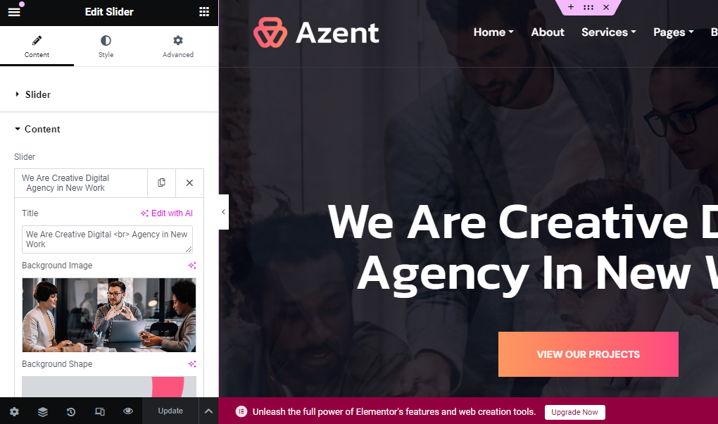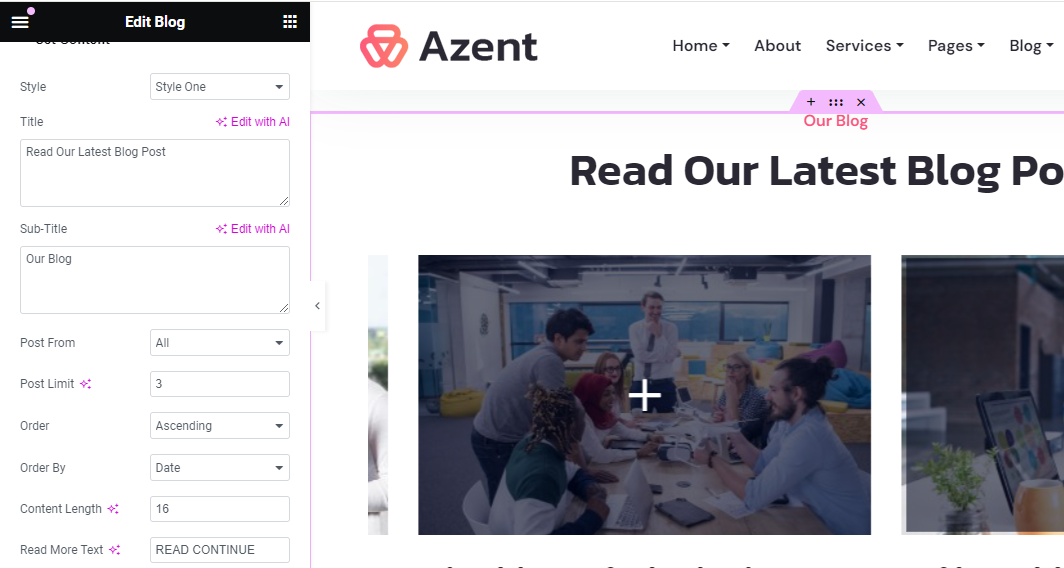 Set Static Home Page(Required): WordPress shows blog posts by default as the front page. If you want to look like demo Azent then you need to set Home Page. See the way how to set Static Home Page Settings->Reading . From here select static page then for Front page select Home and blog page select Blog.