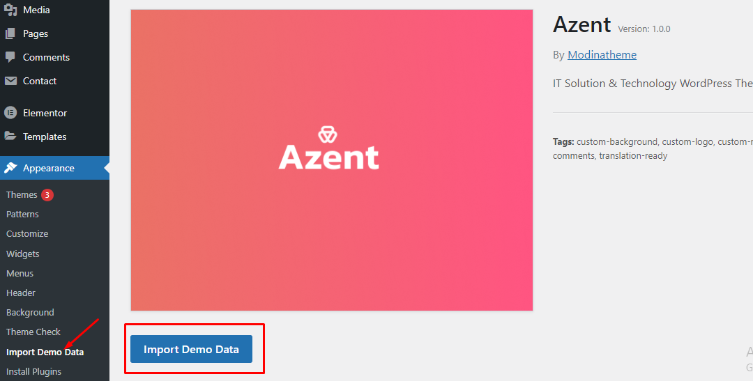 Import Sample Data: Azent Gives you one click demo import option for get this you need to install one click demo import plugin (click here) . After Install This plugin nedd to follow few steps for import demo data