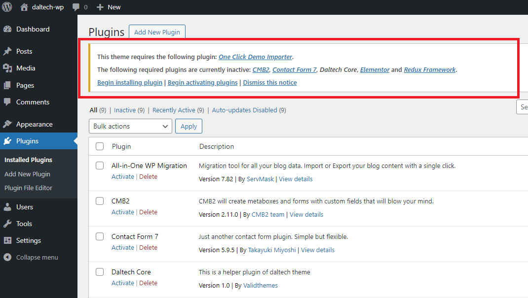After successful theme installation, you'll see the above notice box that you need to install essential plugins. You can click on "Begin installing plugins" or follow the following step.