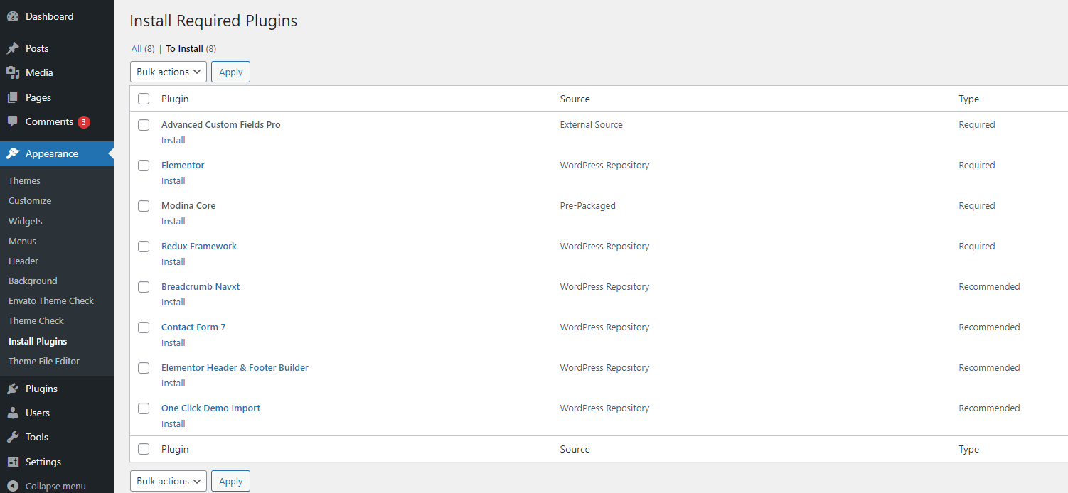 After successful theme installation, you'll see the above notice box that you need to install essential plugins. You can click on "Begin installing plugins" or follow the following step.