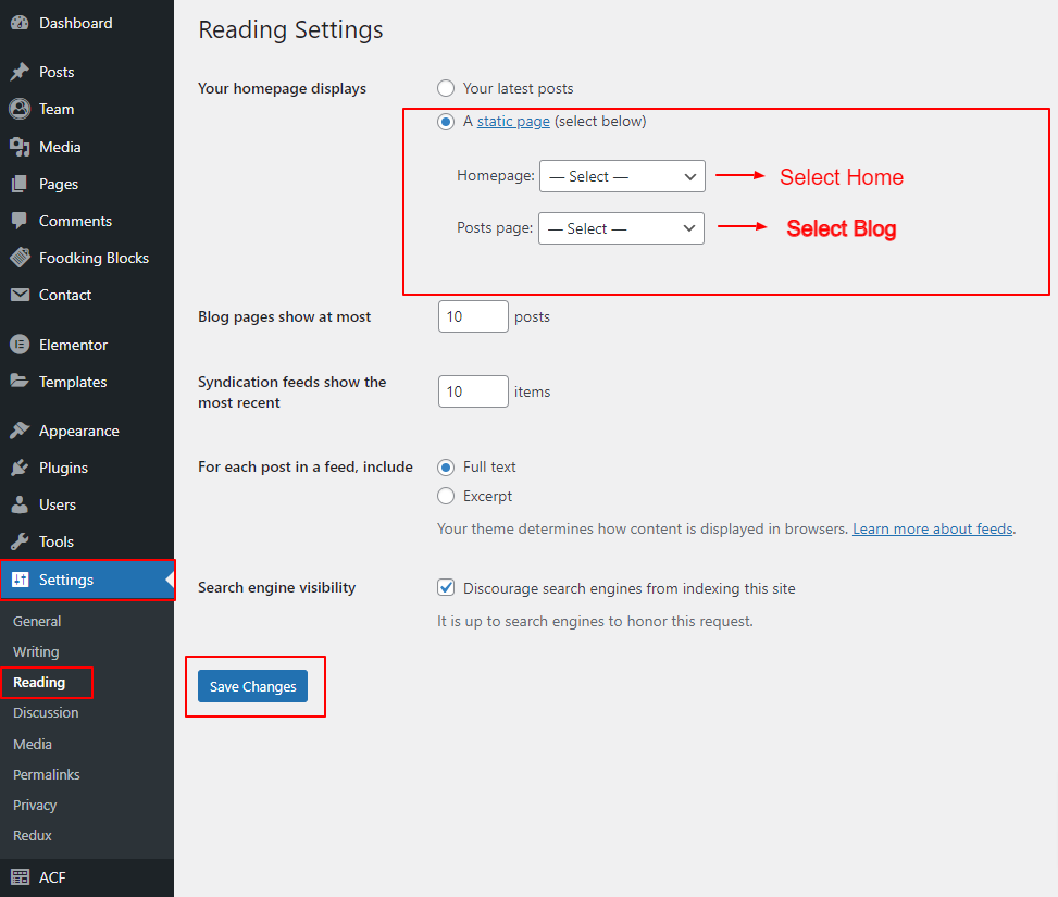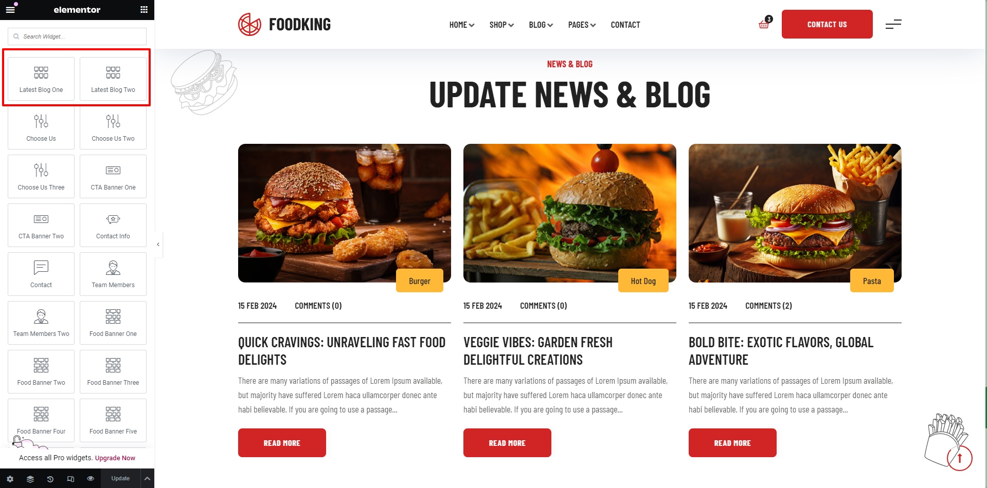 Set Static Home Page(Required): WordPress shows blog posts by default as the front page. If you want to look like demo foodking then you need to set Home Page. See the way how to set Static Home Page Settings->Reading . From here select static page then for Front page select Home and blog page select Blog.