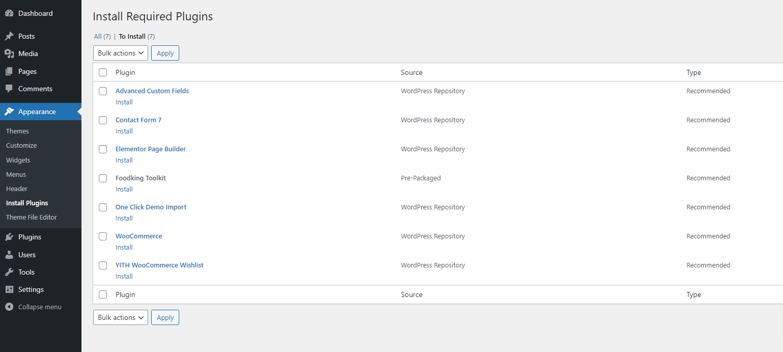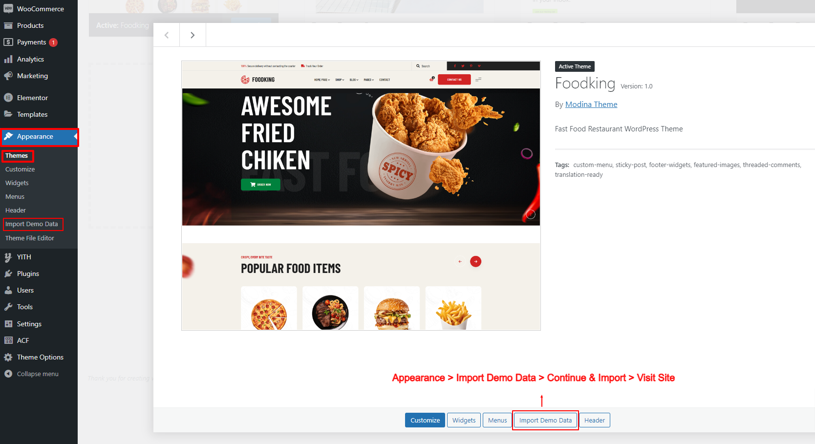 Import Demo Data: foodking Gives you one click demo import option for get this you need to install one click demo import plugin (click here) . After Install This plugin nedd to follow few steps for import demo data