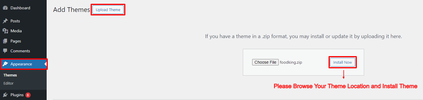 WordPress theme is simply a group of files, called template, bundled together that, when activated in CMS, determine the look and basic function of your site. By using professional foodking theme, you can have your site up and running with a new design - pretty fast. Theme installation is very easy process. Especially when you've chosen the theme you want to use, you'll need to install it into your WordPress website. You'll have the following two choices, as you did when adding new plugins: