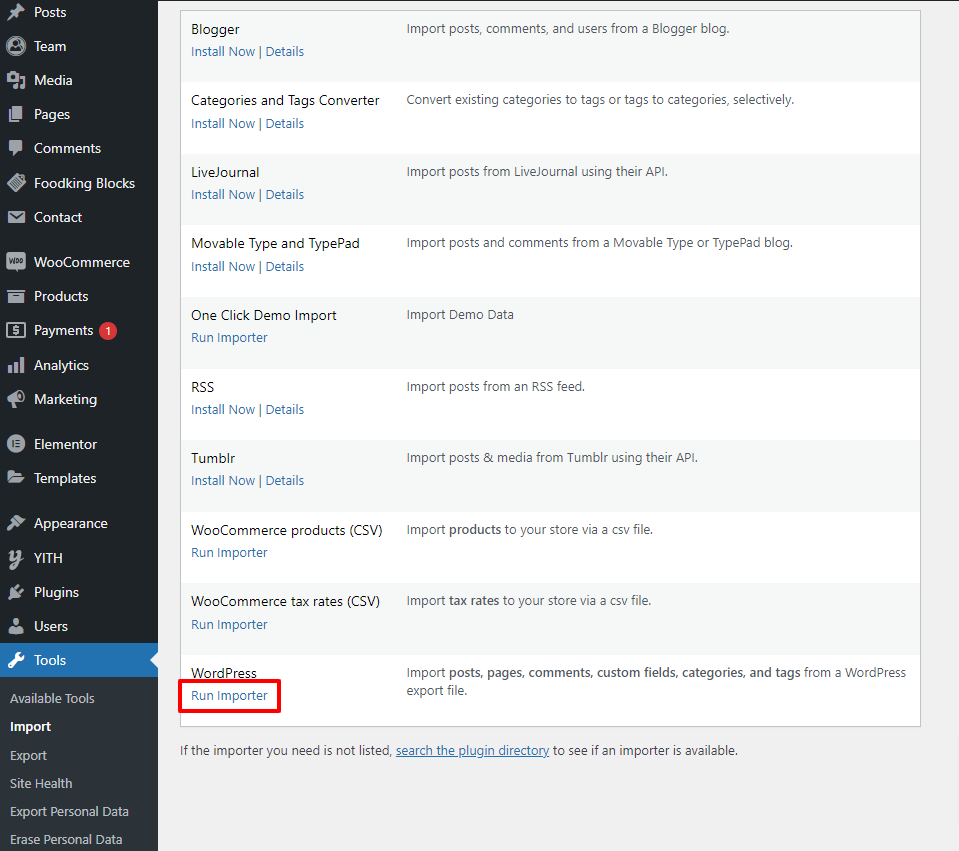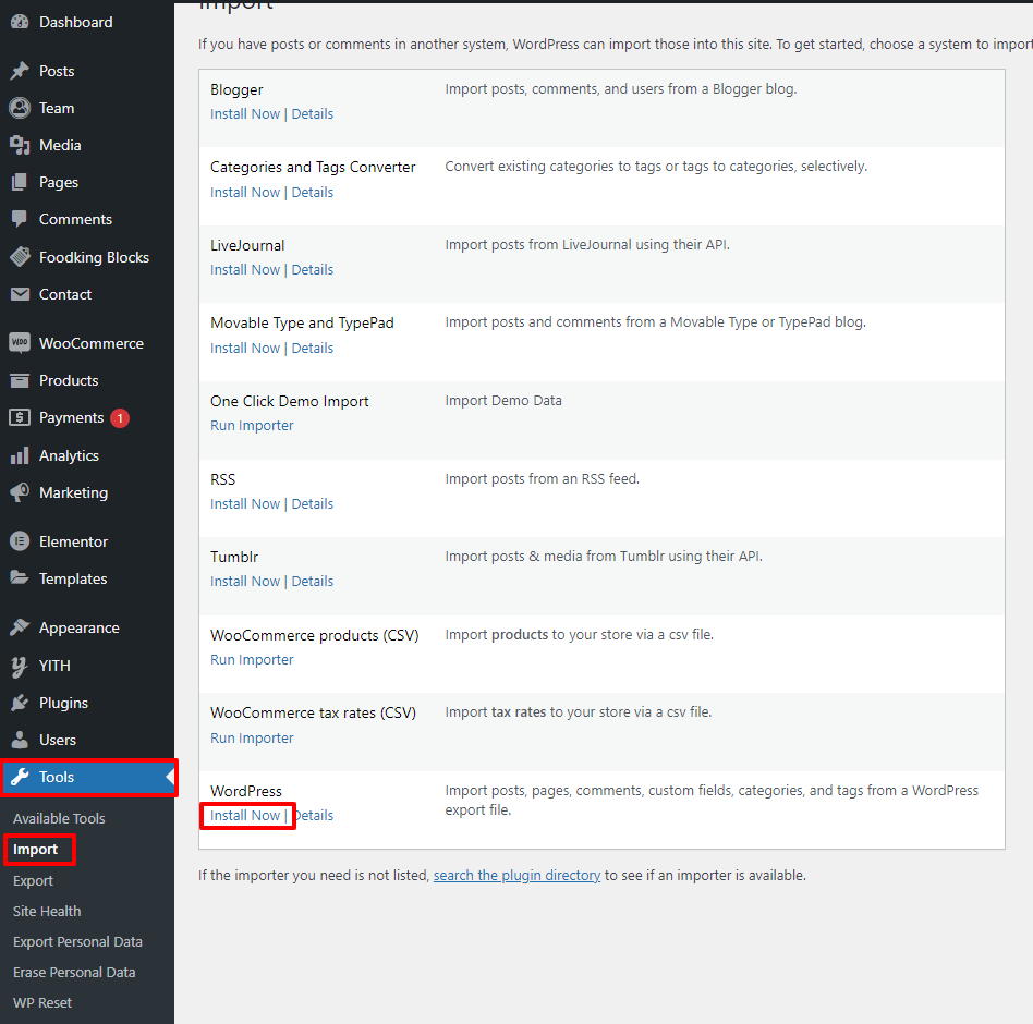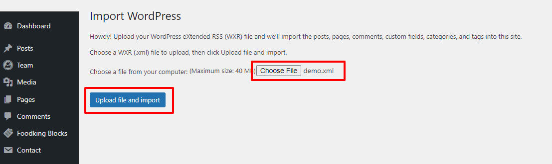 Import Demo Data: Import Demo Data: If you want to use demo data for your website then you need to install demo data. From menu choose Tools -> Import -> WordPress. Click WordPress then you will see the "Import WordPress" option which allows you to upload .xml file from foodking/lib/demo-data Content folder. If this tool not be installed you have to install "WordPress Importer" plugin manually.